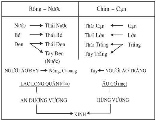 Việc chứng minh tính rộng lớn của quan niệm hôn phối nguồn cội Rồng – Chim ở Tày – Thái, được dẫn giải bởi Cầm Trọng, như ta sẽ thấy, là để dẫn đến một ý đồ quan trọng hơn nữa của ông phía sau, đó chính là: một bộ phận của người Tày – Thái cổ, “từ mấy ngàn năm trước” sẽ là tổ tiên của Việt cổ, tức tổ tiên của Kinh – Mường (Cầm Trọng – Phan Hữu Dật 1995: 35). Cầm Trọng tạo nên sự hậu thuẫn bằng cách dẫn quan niệm của các nghiên cứu ngôn ngữ học với việc phát hiện ra các yếu tố Tày – Thái trong tiếng Việt như quan điểm của Maspero, hay từ ngôn ngữ, Phạm Đức Dương chỉ ra văn hóa lúa nước Việt bén rễ của văn hóa lúa nước Tày – Thái (xem cụ thể: Cầm Trọng – Phan Hữu Dật 1995: 35, và toàn chương II). Và giờ đây, Cầm Trọng trong một công trình viết chung với một nhà dân tộc học Phan Hữu Dật, muốn bồi đắp, minh chứng thêm, cho sự kết nối Việt – Mường như là một thành tố của khối Tày – Thái trong chính huyền thoại khởi nguyên cặp kết hợp thân tộc nguyên cội, thần thoại Rồng – Chim. Điều này, thể hiện dưới ngay chính sơ đồ tổng hợp trước (Cầm Trọng – Phan Hữu Dật 1995: 45).