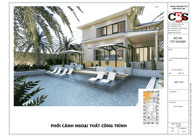 • Thể hiện ý tưởng thiết kế: Mặt bằng tổng thể có sân vườn; Mặt bằng tổ chức không gian các tầng; Mặt đứng