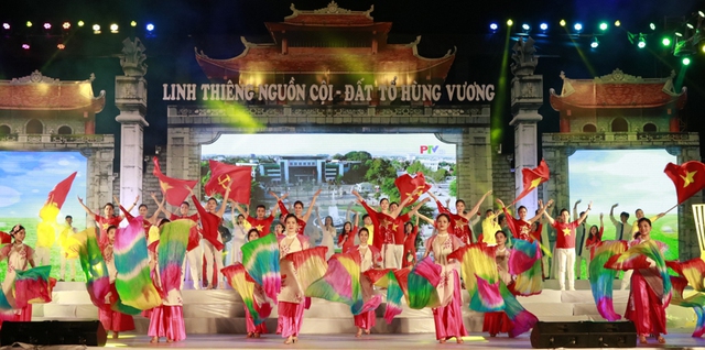Chương trình nghệ thuật "Linh thiêng nguồn cội - Đất Tổ Hùng Vương" được chuẩn bị công phu. Ảnh: Báo Phú Thọ