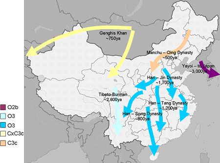 Sự thiên di của những người nông dân trồng lúa nước từ Nam lên Bắc phù hợp với sự lan tỏa các dấu gien tại Trung Quốc, như các nhà khoa học tại Đại học Fudan, Thượng Hải, trong Dự án bản đồ gien của Hội địa lý quốc gia Mỹ 2005 – 2010, và Tổ chức bộ gien người HUGO 2009, đã chứng tỏ.