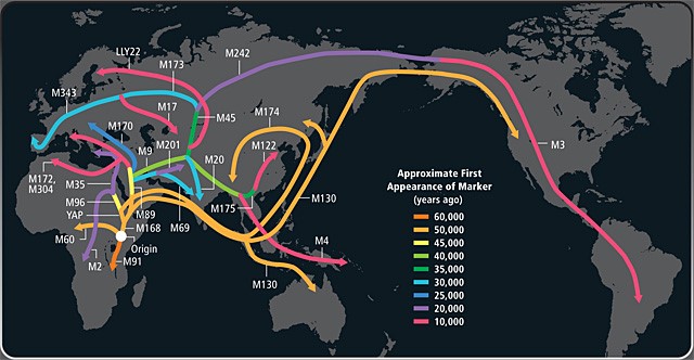 Hình 2: Bản đồ thiên di của những người cha cho thấy nguồn gốc Đông Nam Á của đại chủng Mongoloid