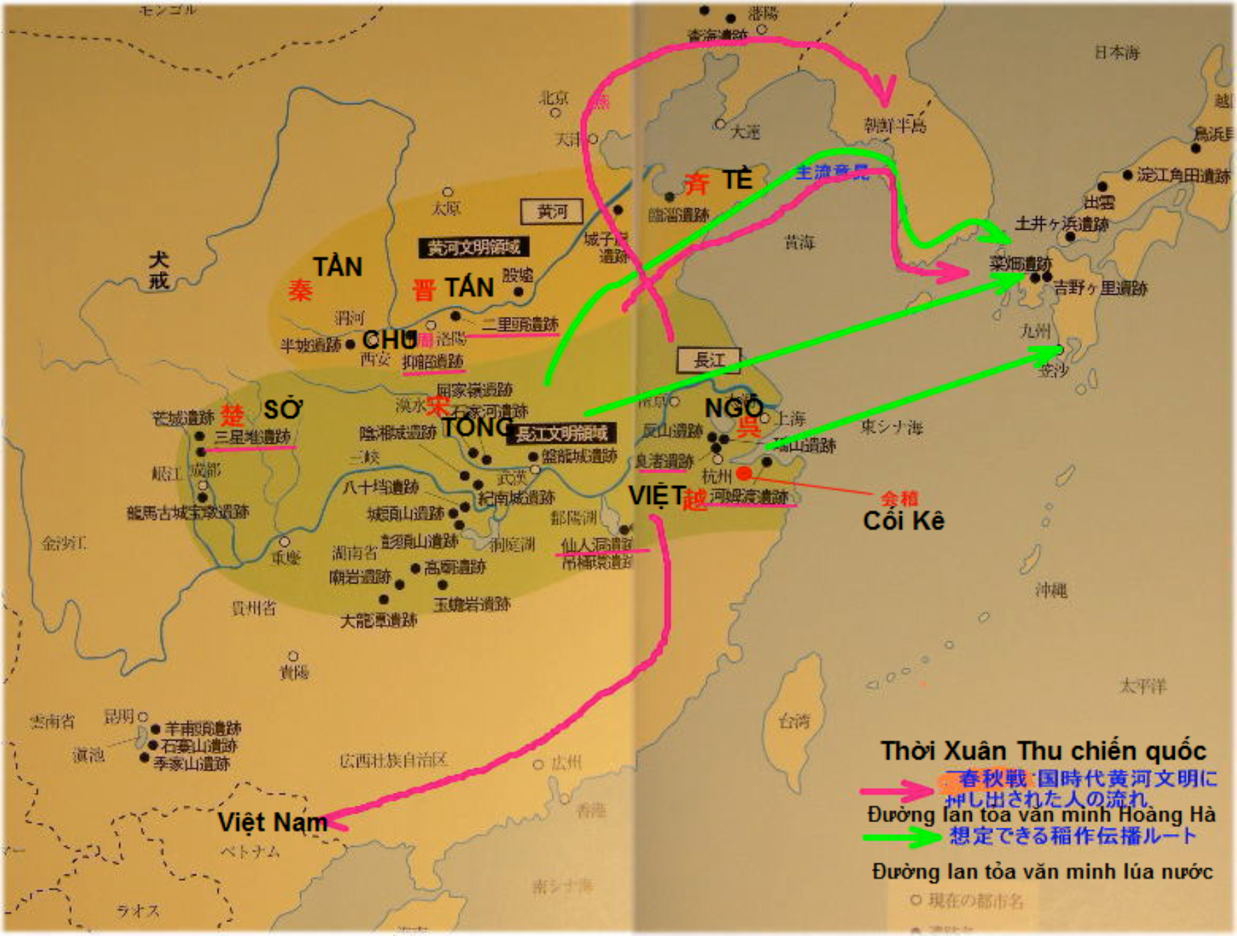 Các nhà khoa học Nhật, Mỹ, đã có nhiều phát hiện, chứng minh nền văn minh Ngô Việt sau khi nước Việt bị diệt và Trung Hoa hóa (đúng hơn là Sở hóa), đã theo dòng người Ngô Việt chạy ra biển sang Nhật Bản (tiếng Nhật Bản đọc Hán tự theo kiểu nước Ngô, nên gọi là ごおん-Go On- Ngô âm 呉音). Nền văn minh đó chủ yếu theo bộ phận tinh hoa của dân Ngô Việt chạy xuống phía Nam hợp lưu cùng Việt bản địa, thành ra văn minh Việt kéo từ Lĩnh Nam (phía Nam dãy Ngũ Lĩnh – tức Bắc Lưỡng Quảng ngày nay) đến Giao Chỉ. Theo phát hiện của Jerry Norman và Tsu-lin Mei (Washington University và Cornell University) thì nhiều từ cổ của tộc Việt nước Ngô Việt hiện vẫn thông dụng trong tiếng Việt ngày nay, ví dụ các từ: chết; chó, đồng (trong đồng cốt), sông, khái (hổ), ngà (trong ngà voi), con (trong con cái), ruồi, đằm (trong đằm ướt), sam (con sam), biết; bọt , bèo…8 Điều này chứng tỏ rằng dân Lạc Việt ít nhiều có cùng huyết thống với dân Ngô Việt xưa. (Xem bản đồ).