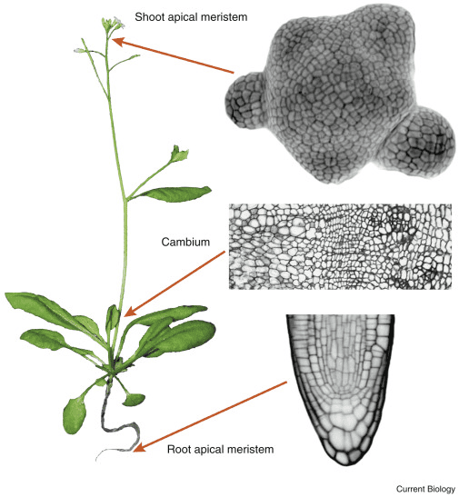 Hình 1: Vị trí và mô học của ba hệ thống tế bào gốc chính của cây | Hình 2: Mô phân sinh đỉnh chồi (SAM). | Hình 3: Mô phân sinh đỉnh của rễ (RAM). |